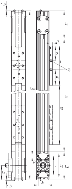 • L2 = 總行程 + L + 40 L tot = 總行程 + L + 40 + 2 x L4。 總行程= 有效行程 + 2 x S(mm)。 注意:允差S指一個(gè)安全范圍,至少應(yīng)為40 mm。 最大支撐軌長(zhǎng)度2000 mm ;通過協(xié)商可提供更長(zhǎng)的支撐軌